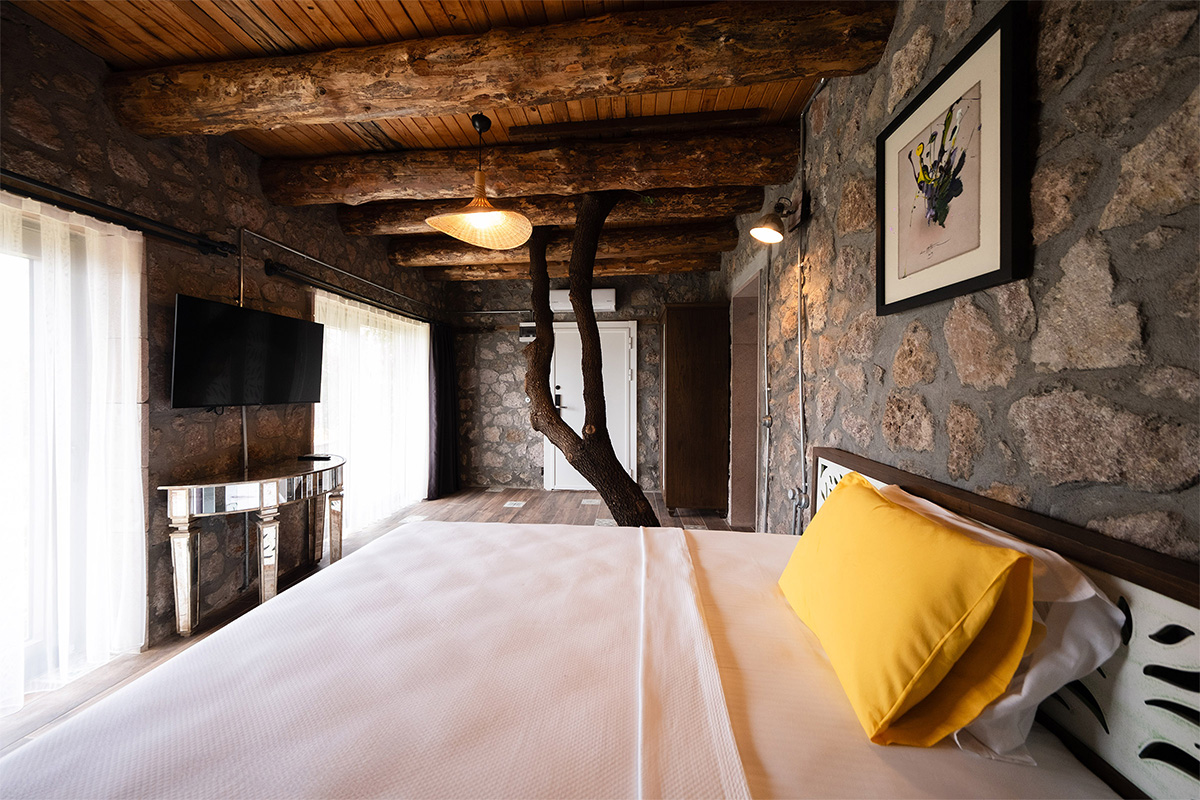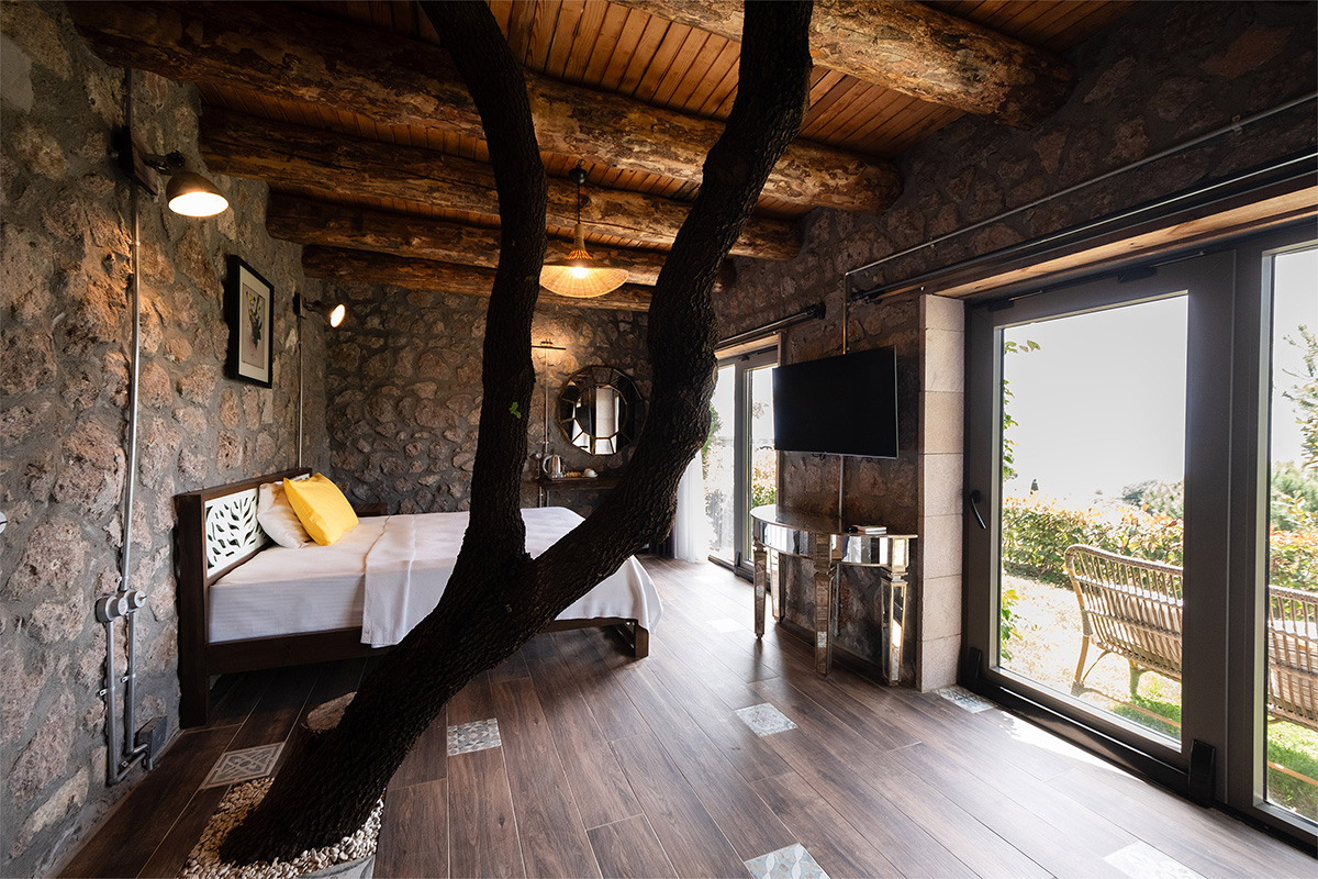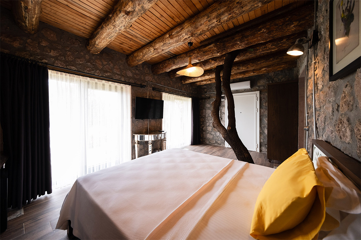 Doğal malzemelerle döşenmiş iç mekan, sade dekorasyonu ve huzurlu atmosferiyle hem bedeninizi hem zihninizi dinlendirir.