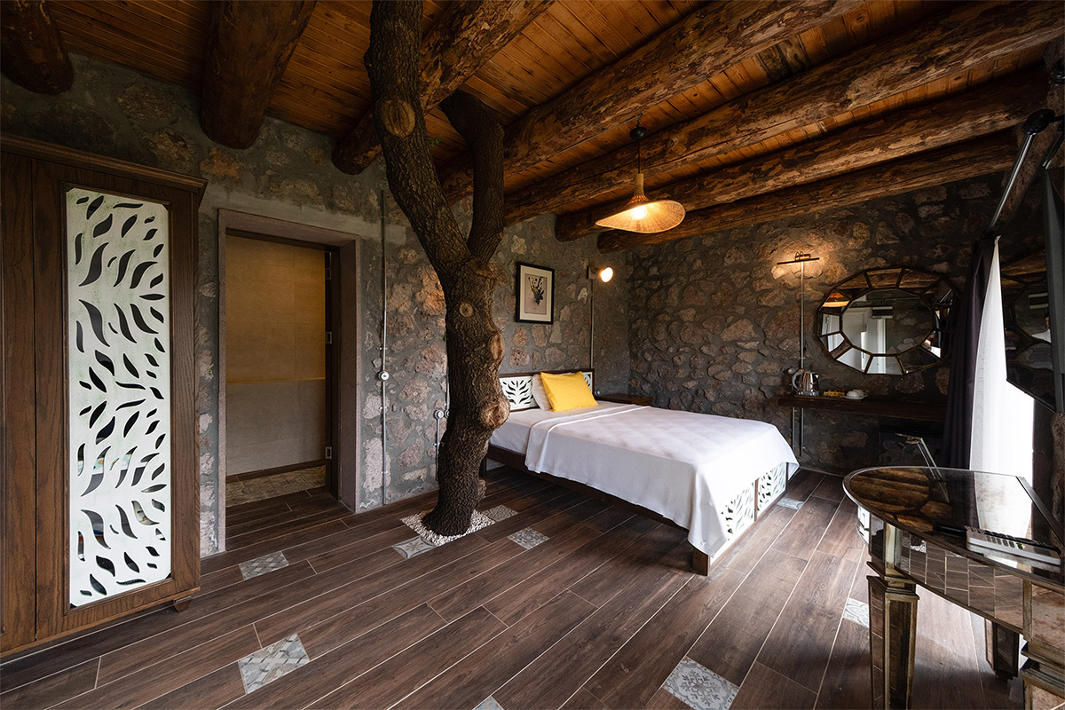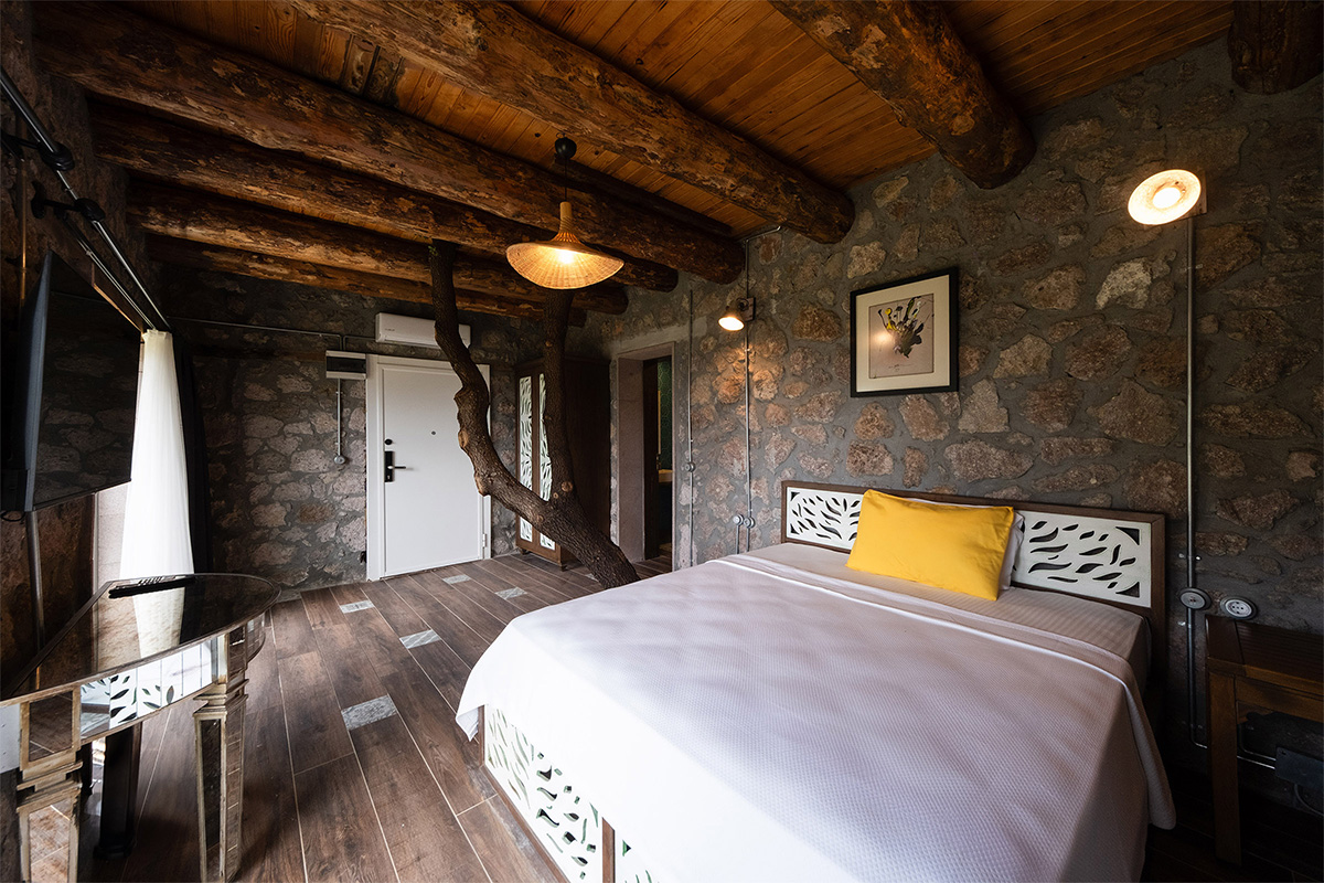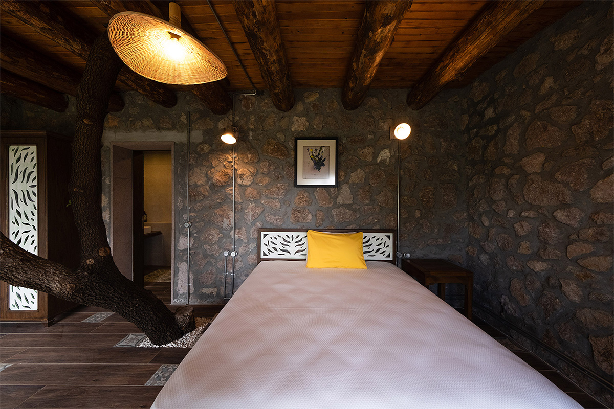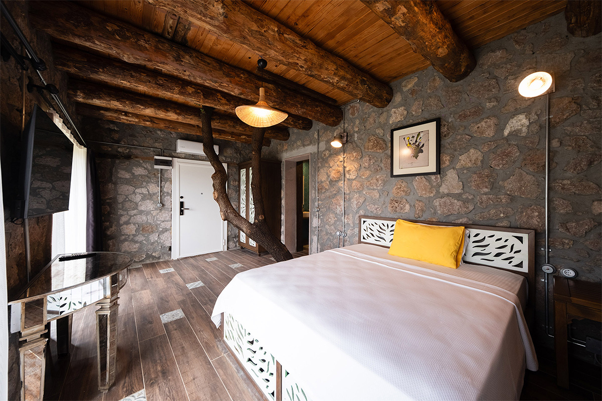 Doğal malzemelerle döşenmiş iç mekan, sade dekorasyonu ve huzurlu atmosferiyle hem bedeninizi hem zihninizi dinlendirir.