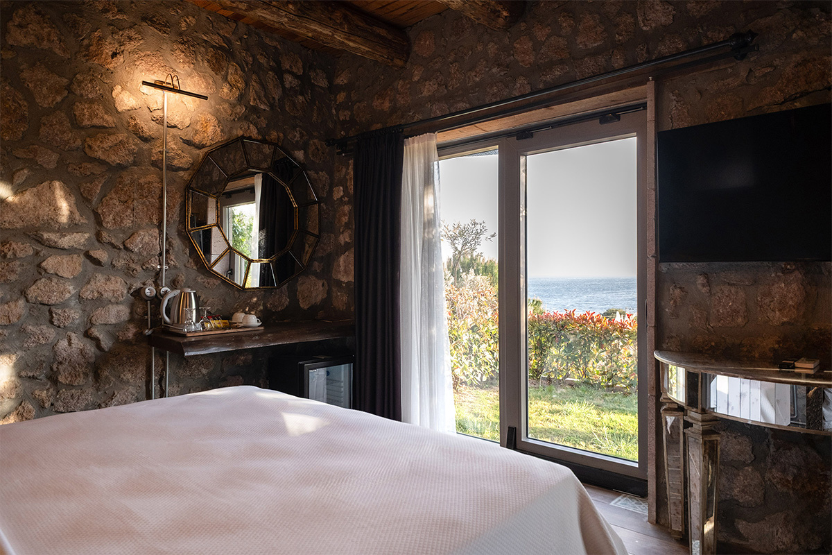 Pencereden içeri süzülen gün ışığı ve dışarıdaki yeşilliklerle birleşen deniz esintisi, konaklamayı bir deneyime dönüştürür.